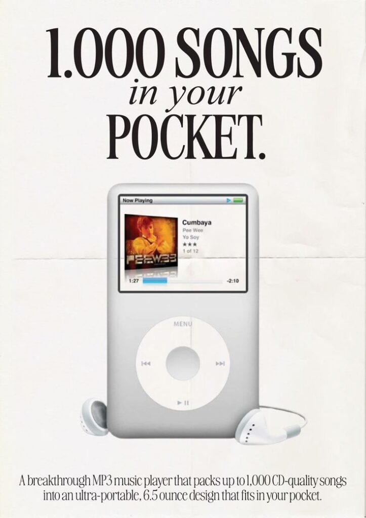 Das ist kein feature, sondern ein Versprechen von Freiheit. Jeder, der damals noch CDs oder sperrige MP3 Player mit sich rumschleppt hat sofort verstanden, wie viel leichter, persönlicher und mobiler Musik durch den iPod wird.